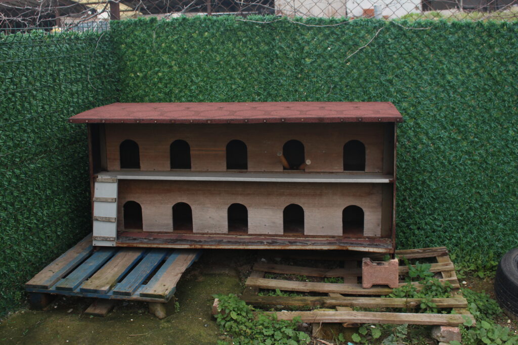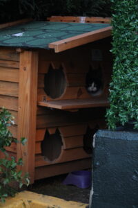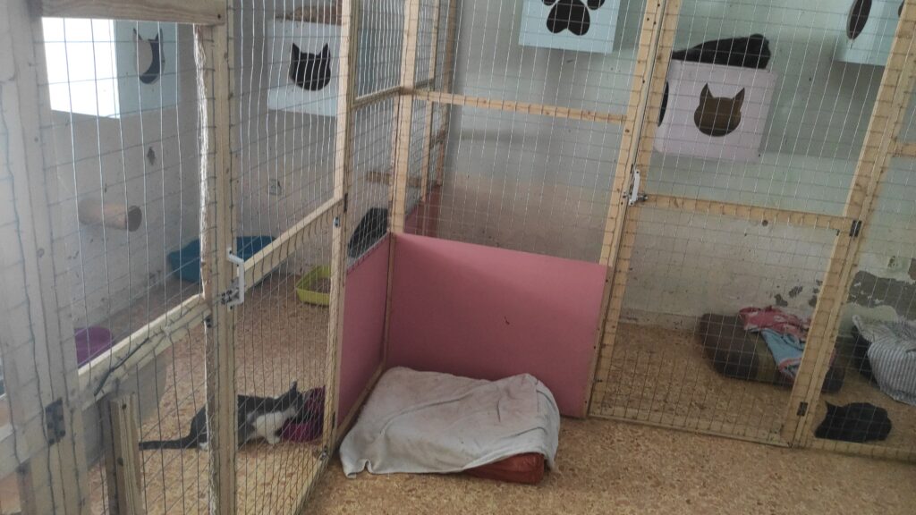 The bigger shelter housed around 50-55 cats, some in enclosures of around 3,5-4m2, others in separate rooms (one room had a small group of 4 cats, the other a large group of around 15 cats) and some in crates (those were cats in need of special care or waiting for their vaccinations, before they could be placed with other cats). Each crate was equipped with a food bowl, water bowl and a toilet. Some of them even had extra levels, so that the kittens within could climb and maximize use of the limited space they had. The larger enclosures and rooms each had several food bowls/ water bowls and toilets per room. A small bathroom could be used to wash out soiled toilets and a kitchen was available to store wet food in the refrigerator, wash the food and water bowls, as well as store and prepare medications.