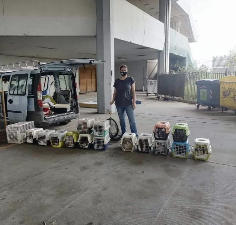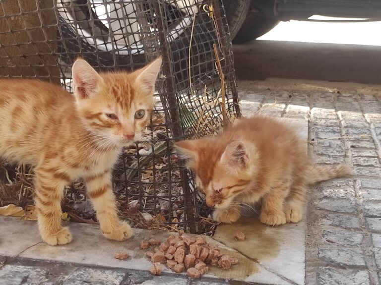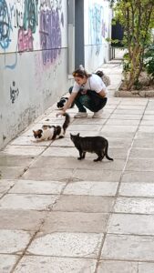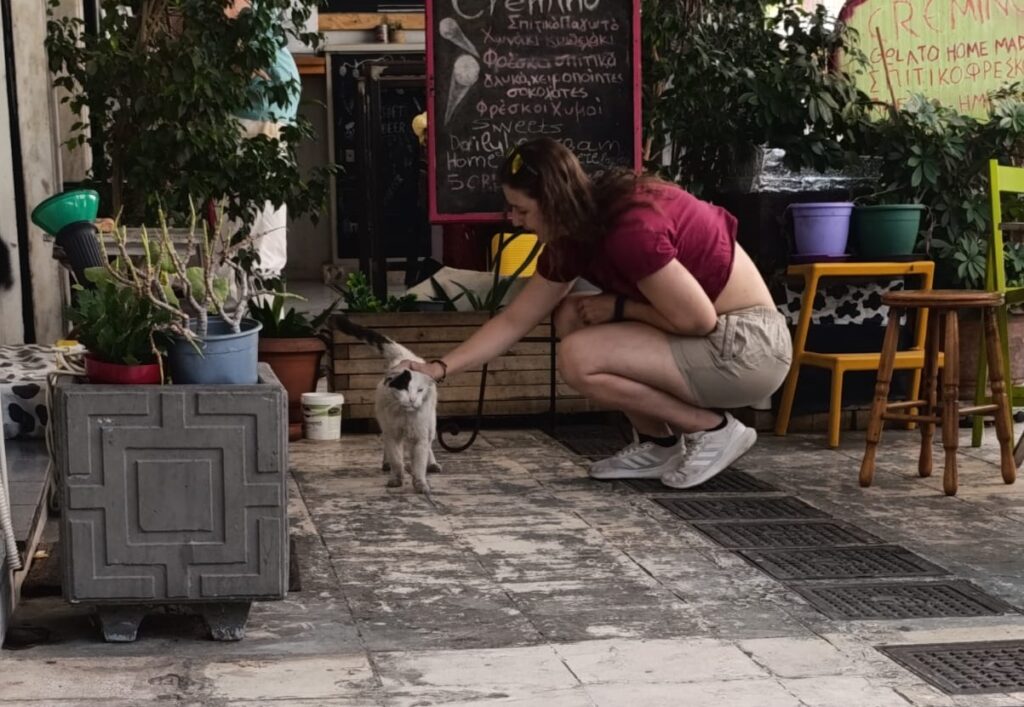 There was never a day where I didn’t see a hungry stray cat or a stray in need of help on the street (often on my way to or from the shelters). Most of the time, I would take a photo of cats that I thought needed medical attention (for example a salivating cat that likely had teeth problems, or a cat that seemed to have an eye infection) and send Flora the location. She usually knew the person who took care of the group of cats living there and could check in with them about my concerns. However there were also two kittens with eye infections (one very badly affected), that I first saw in the evening walking from the metro station to our AirBnB. I took photos (as best as I could) and sent Flora the location, and she wanted to contact a woman who feeds them. I saw the kittens again in the evening one or two days later and then a third time (the first time that I saw them in daylight) the next day. The daylight revealed the eye infection to be even worse than I had initially thought, and I decided to take matters into my own hands. I called around trying to find a vet clinic that was open (Chris and I had come at an unconvenient time of the month, where many businesses closed for holiday), bought a pet backpack at the pet shop and went to look for the kittens again. I’d gotten a recommendation for a vet clinic in Piraeus and had discussed with them about bringing in the kittens. Back at their usual spot, I found their mother cat and some of their other colony cats, but didn’t see the kittens at first. Determined to find them, I searched around in the alleyway between the houses and finally found the kitten that was more affected at the top of some stairs. I gave it some food and then scooped it up into my backpack. As I want back down the stairs, on the lookout for its sibling, I spottet the second kitten climbing down a tree. This one was a little more feisty (or maybe it just had more energy than the other one), because it hissed at me when I got closer, but my food still lured it in and I managed to scoop the second kitten up as well, place it in my backpack with the first and took off towards the metro.