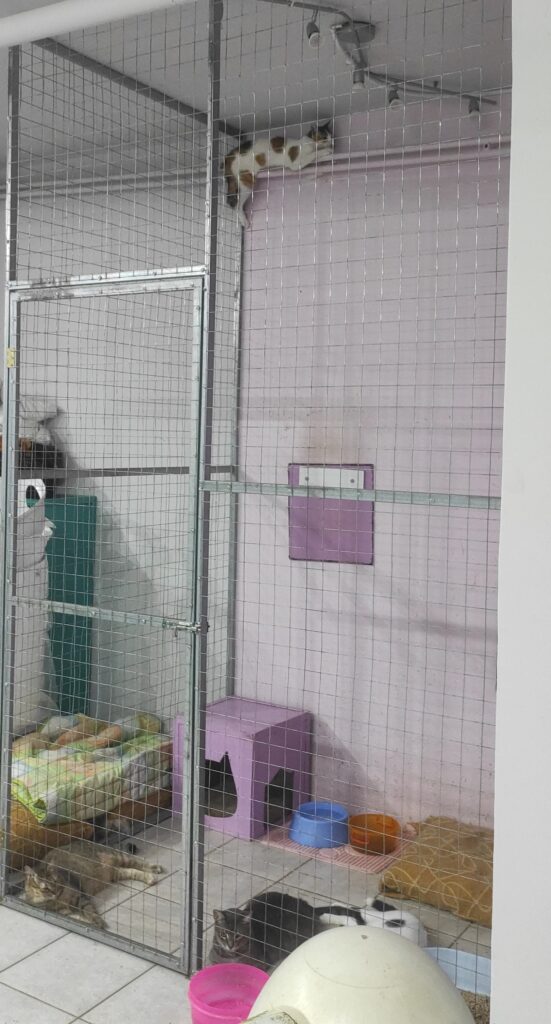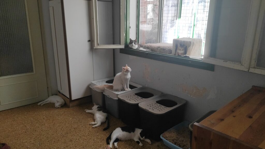 Most days of our trip, I spent part of the day with my boyfriend, doing guided tours or visiting nearby greek islands by ferry, while visiting one of the shelters in the evening (always coordinated with Flora), to change water bowls, top up or refresh food, clean the litter boxes and sweep the cages/ floors. Unfortunately neither shelter had AC while I was there (the AC in shelter 1 had stopped working just a few days before my arrival), so it was sweaty work, even in the evenings when the temperature had cooled down a bit.