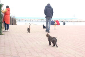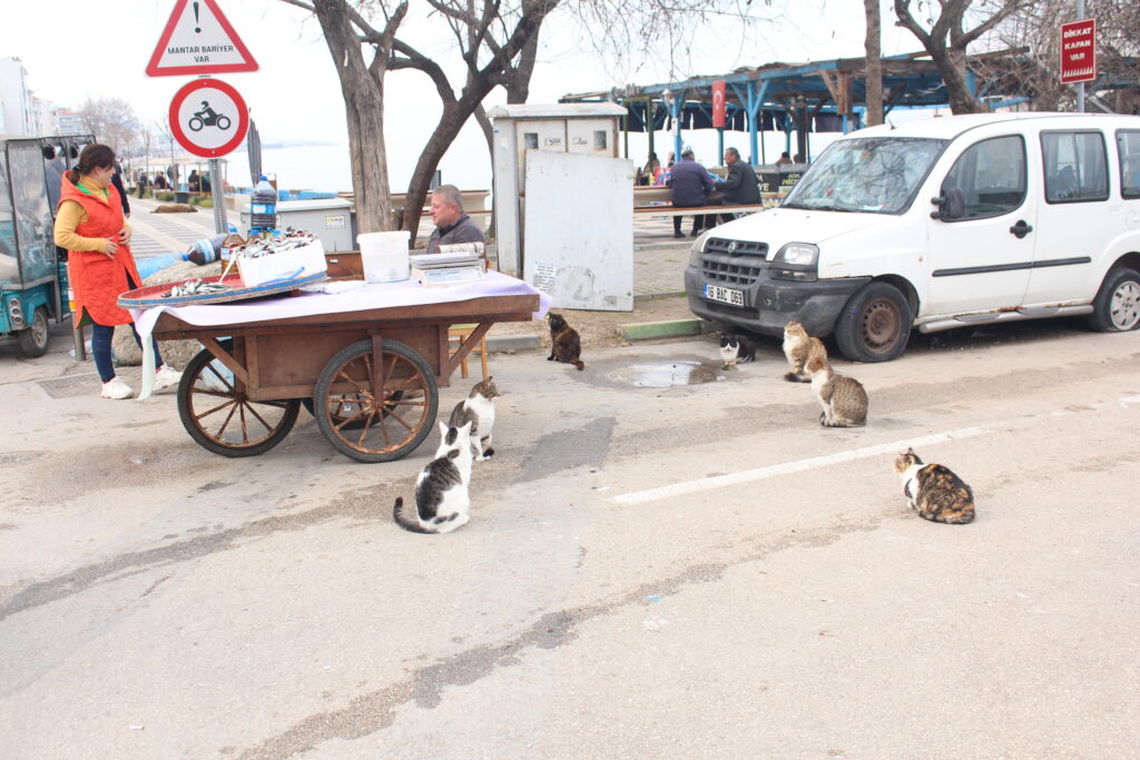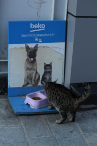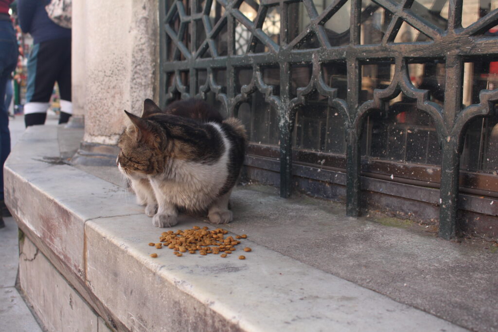 When travelling through Istanbul to the European side, I came across an area with a lot of trash lying around. I saw a few stray cats as well as a group of, I think 5, stray dogs. I tried to offer some food to the cats and even tried to make separate piles for the cats and the dogs, so that both could have some, but the dogs kept following me. One dog even chased off one of the cats into the street. I felt so bad for that hungry kitty! I learned that the cats do not only have to compete with each other for food, but at least in this case, also with the dogs, where they are likely to get the short end of the stick and lucky if they are not injured in the process.