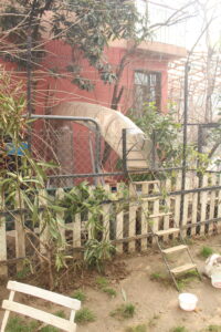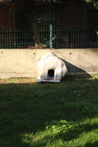 I travelled to the shelter by bus, walking the last part of the way. It is located behind a shopping mall in an area with mostly car shops around. In front of the shelter, I could see a wooden dog-hut (already a little run down), as well as a white dog lounging inside the shelter area, between the fence of the shelter grounds and a small building.
