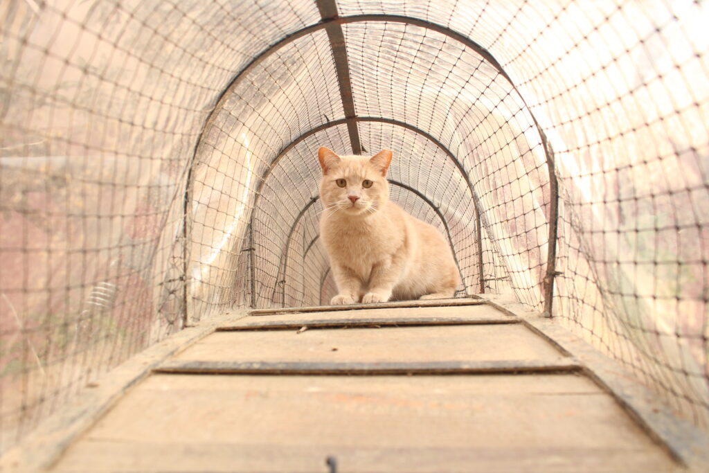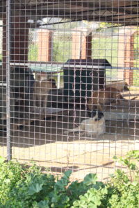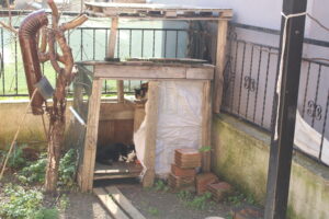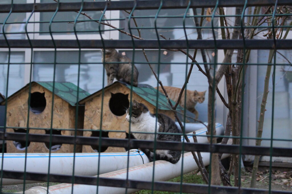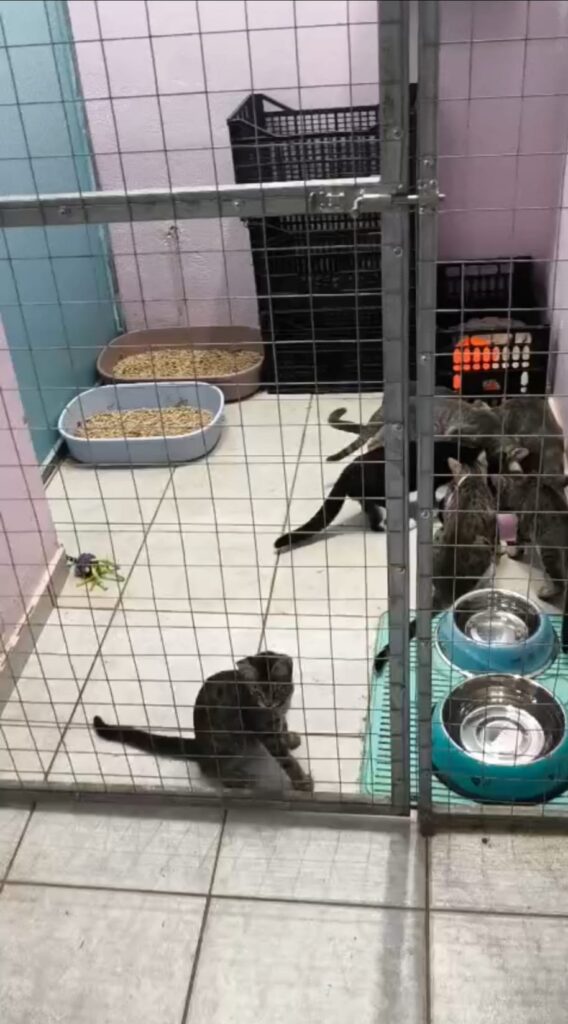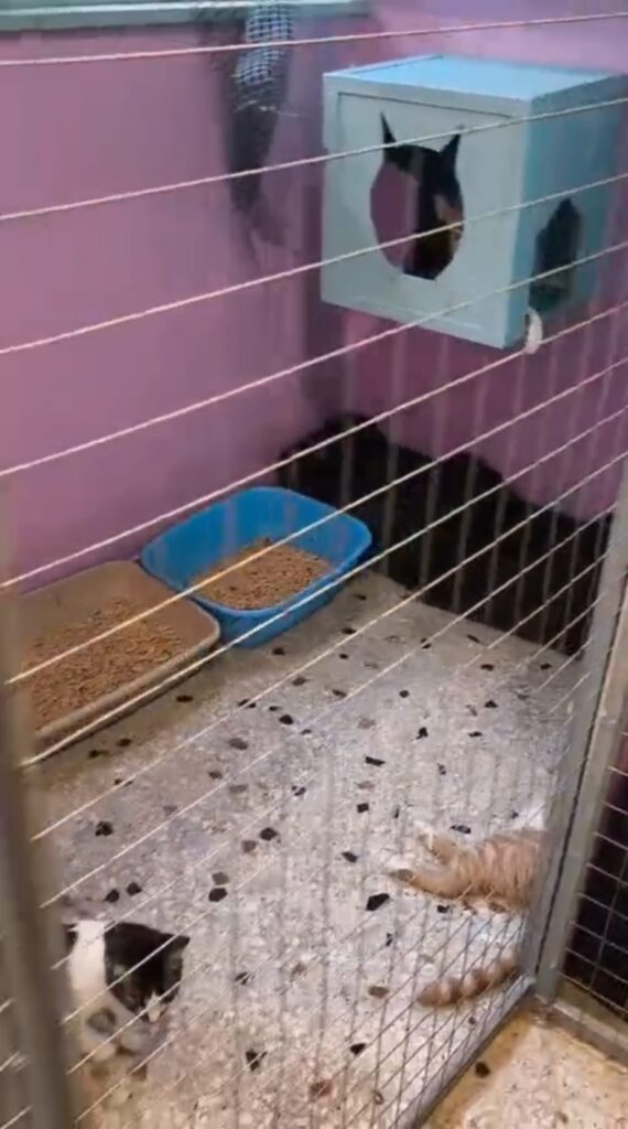 The smaller shelter had 5 enclosures (for small groups of cats) and 6 crates (for individual cats) as well. In total, this shelter housed around 30 cats. The enclosures and crates were equipped with food/ water bowls and toilets in the same way as the bigger shelter. There was no kitchen here, but a refrigerator, a sink and a small toilet.