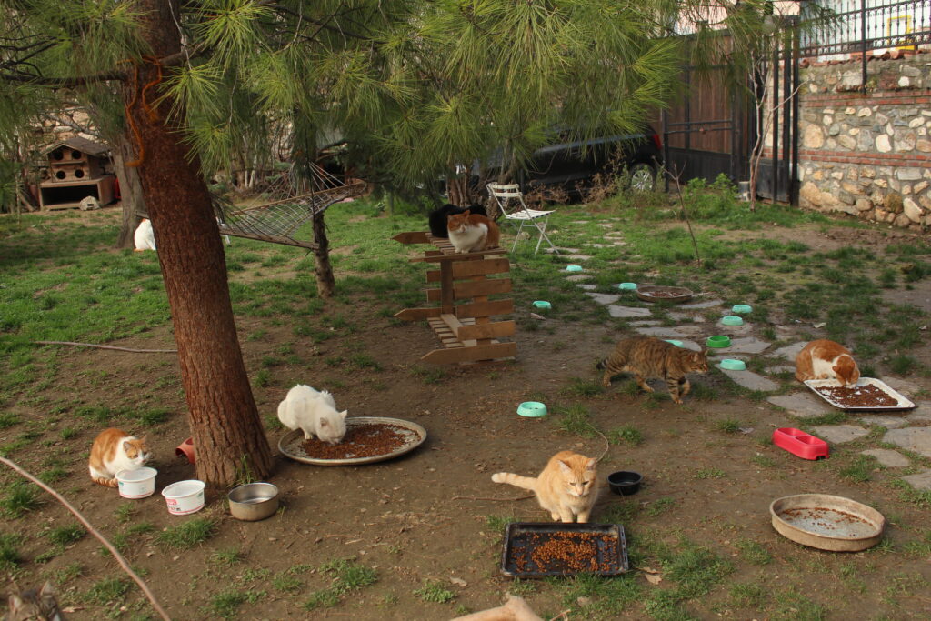 Hatime lived relatively close by in the center of Bursa. The family home was rather large, and filled with cats in almost every level. She and her sister were caring for a cat that had to be hand-fed, due to symptoms of neurological FIP. They showed me how to do it and let me try my hand at feeding her as well. Hatime showed us around. Groups of cats were living in different rooms throughout the house. Some of them were receiving treatment at home, others were families, who were waiting for neutering. A big room in the basement level was equipped with lots of cat furniture, and beds, and also had access to a tunnel leading from the basement room to the fenced in cat yard. Melih translated, as I told Hatime all about Kindness for Kitties. At the time of our visit it was already dark, but I made plans to return the next day, so that I could take daylight photos of the cats and the yard, before leaving for the next city. Hatimes private shelter was amazing, and truly what I wish every Rescuer could have. She told me, that there were more than 100 cats in total, and that of course making sure they were all fed and healthy was a big financial burden. I told her, that she could join Kindness for Kitties if she wanted to, as I would love to support her, that the association is less than a year old (at that time) is still small at the moment, but that I am trying to help it grow and that I have many ideas for the future.