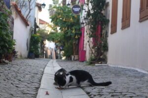 After a quick photoshoot with Buse’s cats, we went out to feed strays in the apartment complex, where we met Minis, one of the cats listed on the website, who had previously been treated with Buse’s help. We did a little photoshoot of her as well (check out the photo below), before going out for dinner.