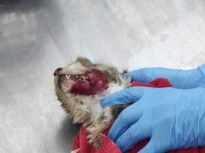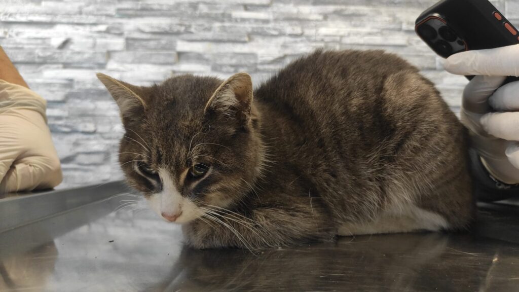 I found Cali when travelling back from Buse to Meral. After I had left the subway and was on my way to walk the rest of the way, I came across several stray cats, as one does in Istanbul. When I was approached by one of the stray cats, I noticed some stairs leading down from the streets towards a basement. And at the bottom of those stairs, something caught my eyes. I took a closer look and the gray something down there turned out to be a cat. It did not move, even when I approached, it just barely lifted its head and meowed in distress. I could not see any visible injuries or signs of a respiratory or eye infection in the cats face, but its demeanor and the distressed meows led me to believe that it was not okay and needed my help. I immediately made my way to Yasar’s vet clinic to ask for help. I was scared, that if I attempted to pick the cat up and carry it, it would run off. Mustafa and I took some food and a transport box and went to get it. The little kitty refused the food and seemed too weak to even attempt to run off. He agreed, that it was in need of help.